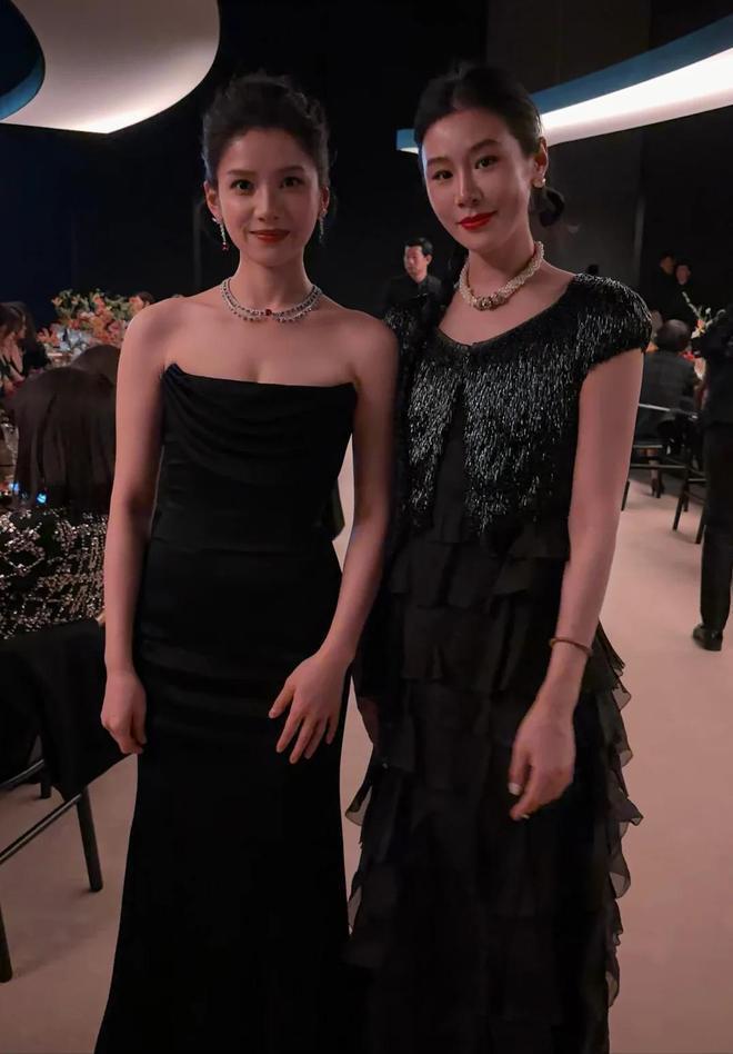 年轻一辈里,张婧仪穿粉黑撞色低胸礼裙,腰上拼接设计把细腰勾勒得清清楚楚,脖子上 4.06 克拉白钻的猎豹项链价值不菲,可再贵的珠宝也没抢过她的青春气。